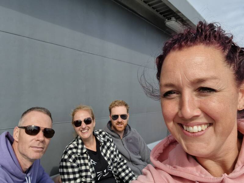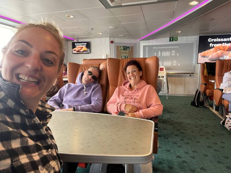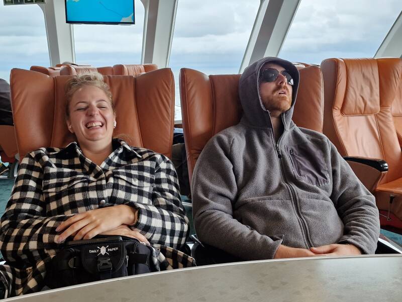 Tijdens de overtocht kreeg ik het even heel benauwd. Na het sturen van een foto via WhatsApp kreeg ik een sms dat ik 80% van mijn buiten Europa bundel had verbruikt. En twee tellen later kreeg ik nog een sms dat ik 100% van mijn buiten Europa bundel had verbruikt en uit veiligheid werd afgesloten van het internet. Blijkt dat je op de boot op een satellietnetwerk zit, wat ontzettend duur is in gebruik... Dat was dus een hele dure foto... Na van de schrik bekomen te zijn, hebben Stefan en Lex nog even undercover een tukkie gedaan in de heerlijk liggende stoelen van het lounge gedeelte, waar we stiekem naar binnen geslopen waren zonder extra te betalen.