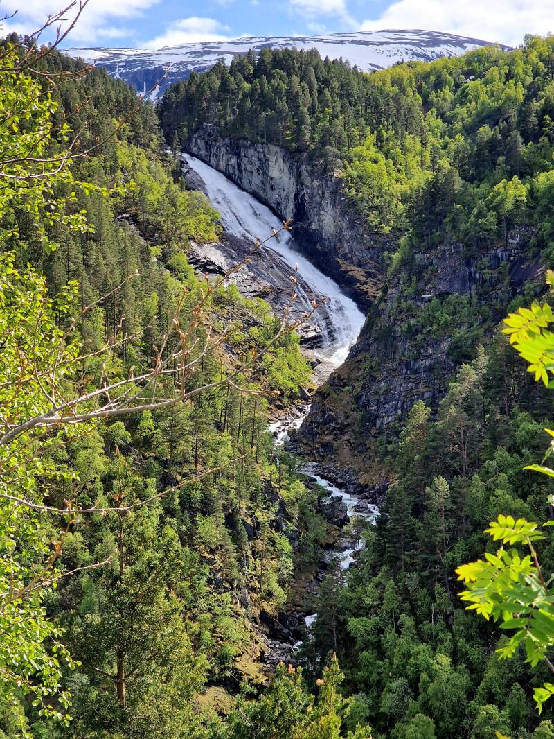 Eindelijk komen we op het punt dat we merken dat we nu toch gaan dalen, maar eerst nog het fantastische uitzicht op de enorme Linndalsfallet! Het was het afzien meer dan waard!