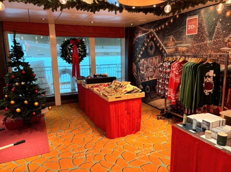 De boot is helemaal in kerstsfeer. Er is zelfs een ruimte waar een kerstmarkt is. Het weer is onstuimig en er wordt via de speaker al gewaarschuwd voor hoge golven. Nu is het nog rustig, dus Hannah en ik gaan even shoppen. Bij de kerstmarkt krijgen we een limoncello (het is vast ergens al wel vijf uur...) en gingerbread om te proeven. Ook staat er nog een kraampje met warme chocomelk. We kopen wat spulletjes en horen van het meisje achter de kassa dat we, als we nog voor 200 Deense Kronen meer besteden, we dan een voucher krijgen voor een gratis overtocht. Dat is wel een meevaller, aangezien Steef en ik sowieso nog een keer heen en terug gaan komend jaar!