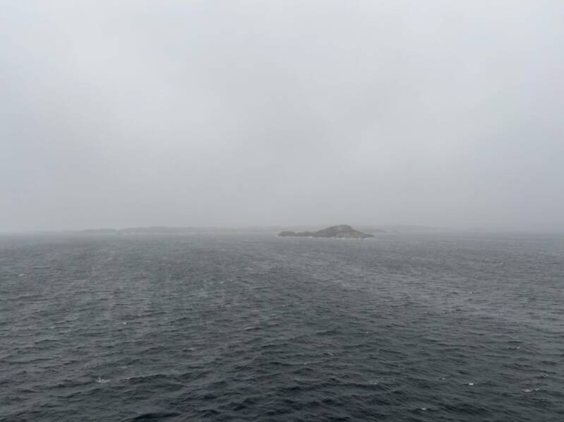 Noorwegen heeft het warm. Net zoals in Nederland is ook hier de winter nog niet heel erg begonnen. Je hoopt toch ergens dat je aan komt varen en een paradijselijk, in wit gehuld Scandinavië treft, maar helaas... Het regent, het is mistig en alles is bruin/grijs... Wanneer we van de boot afkomen is het 9,5 graden buiten. Gelukkig komt de schoonheid van het land af en toe wel even uit de mist tevoorschijn.