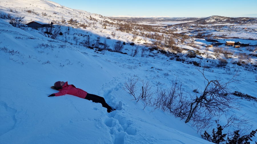 Na een rustige opstart hebben we eigenlijk allemaal wel zin om even te wandelen. We kijken via Ut (Noorse app) en via Komoot (Nederlandse app) waar er ergens in de buurt een mooie route is. Er wordt niet heel veel weergegeven in onze streek. Het is al heel snel veel te ver weg. En al snel komen we er ook achter dat uiteraard alle wandelingen op niet-winterse-omstandigheden zijn gebaseerd. Bijvoorbeeld een wandeling van 12 km met 400 hoogtemeters loop je in de zomer zo weg, maar ploegend door een pak sneeuw is dat toch een iets grotere uitdaging. En ook hierbij kan je in de winter de te lopen tijd minimaal wel x2, 3 of misschien wel 4 doen.